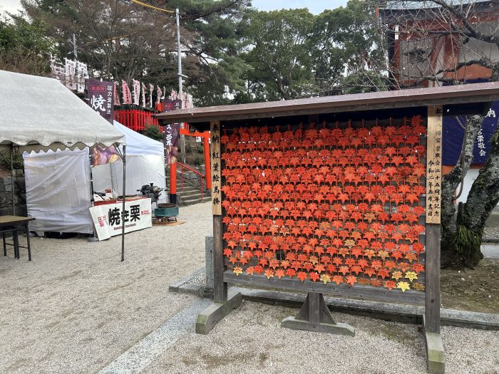 ひらひらと雪が舞い落ちる中、ずらりと掛けられた紅葉の絵馬からは、